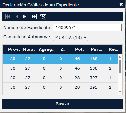 En caso de estar la capa de Cultivo Declarado esté disponible, se activa el cursor para la consulta gráfica de las líneas de declaración de un mismo expediente, de manera que haciendo clic sobre un elemento de la cultivo declarado se mostrarán las líneas del expediente seleccionado .