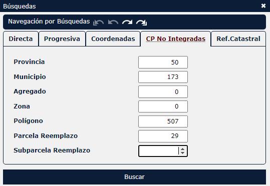 3. Barra de herramientas3.3 Buscar 3.3.4 Búsqueda por Cp No Integradas Se realiza introduciendo los códigos correspondientes a la parcela o subparcela de reemplazo que se quiera localizar. El botón de búsquedas, sólo se activa para las búsquedas de parcela y subparcela de reemplazo. Ejemplo de búsqueda: