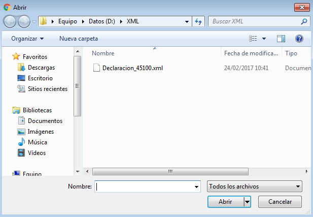 es posible cargar un archivo de declaración local (ubicado en un disco local o de red). Tras hacer click se abrirá un cuadro de diálogo para seleccionar el archivo en cuestión: