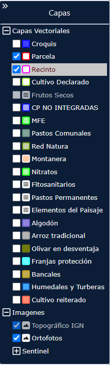 Los grupos de capas dentro del panel de leyenda se pueden plegar y desplegar pulsando sobre los controles