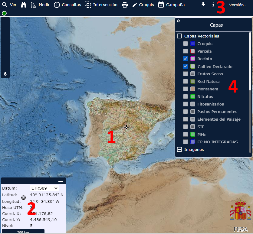 A continuación, se muestra una posible vista del Visor SigPac, en función del zoom, donde se distinguen las zonas principales de la aplicación: