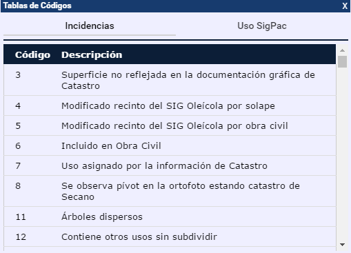 3. Barra de herramientas3.12 Info 3.12.4 Tablas de códigos Al hacer click en el botón Tablas de códigos se muestra un formulario en donde pueden consultarse las descripciones de las distintas tablas de códigos utilizadas en el visor: