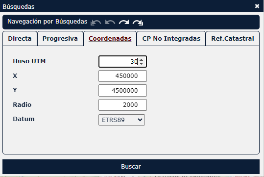3. Barra de herramientas3.3 Buscar 3.3.3 Búsqueda por coordenadas Se efectúa especificando el huso, las coordenadas del punto a localizar (que se mostrará en el centro de la pantalla) y el radio de visualización: