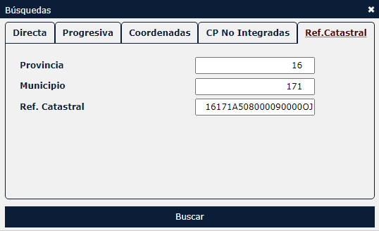 3. Barra de herramientas3.3 Buscar 3.3.5 Búsqueda por Referencia Catastral Se realiza introduciendo los códigos correspondientes a provincia, municipio y referencia catastral de la parcela que se quiera localizar. Ejemplo de búsqueda: